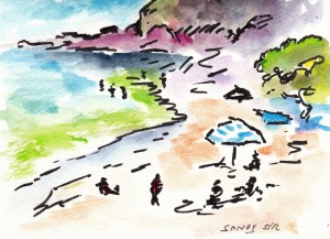 Sometimes quickies are the best and most satisfying. This Inktense and Ink painting on a water color greeting card captures the feel of the Southern California Beach.